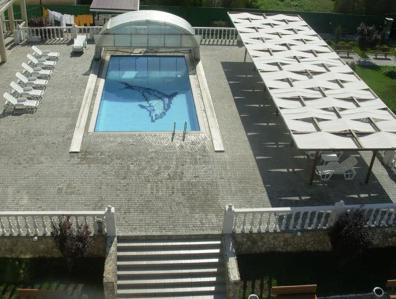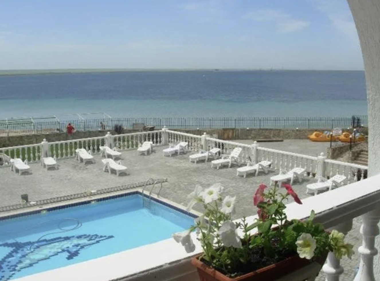 Отель имеет уютную территорию, состоит из двух 4-х этажных корпусов и собственной столовой «Пальмира». Со стороны моря расположен бассейн с пресной водой и релакс-зоной, где проходят занятия по акваэробике. Для детей организована активная анимация, проводятся игры, мастер-классы, по вечерам мини-диско.
