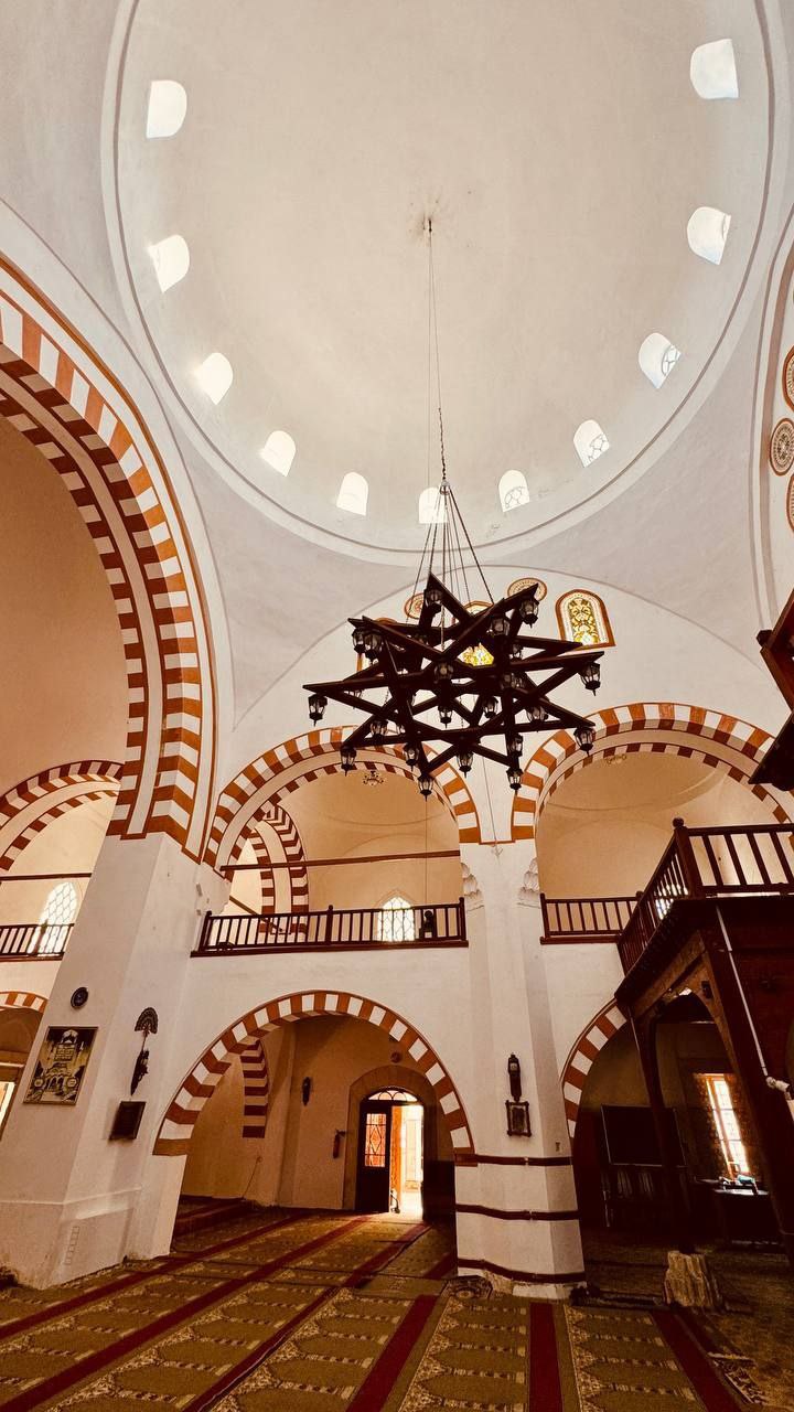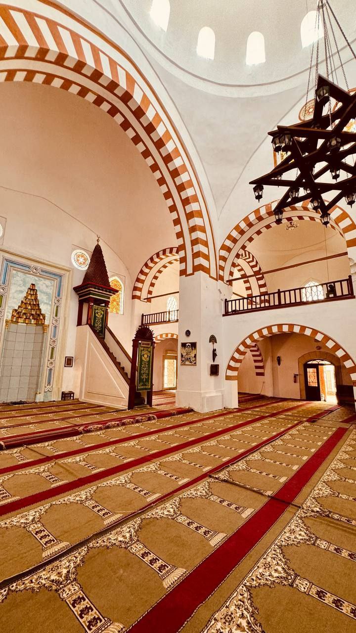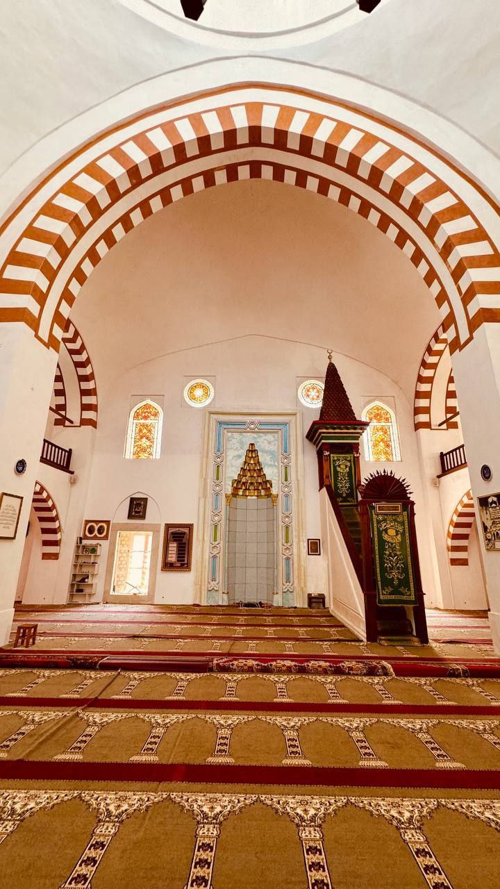 По бокам возвышаются два минарета высотой около 35 метров, а внутри расположен просторный молитвенный зал с михрабом (нишей, указывающей направление на Мекку) и мимбаром (кафедрой для проповедей).