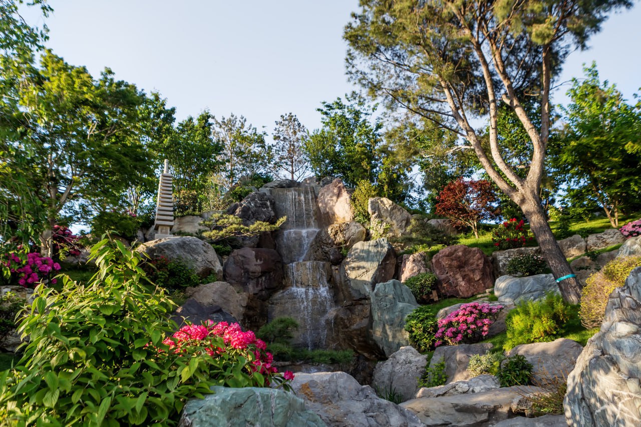 Здесь раскинулись водопады, ручьи, пруды с «парящими» камнями. Необычный пейзаж сформировали растения, привезённые из заповедников Японии и Европы — их здесь свыше 3000 видов.