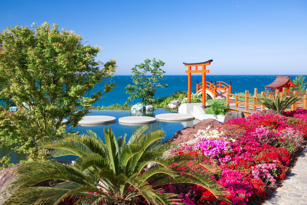 В саду можно посетить термальный комплекс с классическими онсэнами (открытыми термальными купелями). Вода комфортной температуры, обогащённая полезными минералами и микроэлементами, расслабляет и успокаивает.